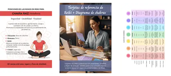 ✓ Tarjetas de Referencia Reiki + Tabla de Chakras – $ 27Tarjetas visuales y prácticas con posiciones de las manos, chakras y flujos energéticos. Ideales para consultas rápidas y apoyo en sesiones presenciales u online.